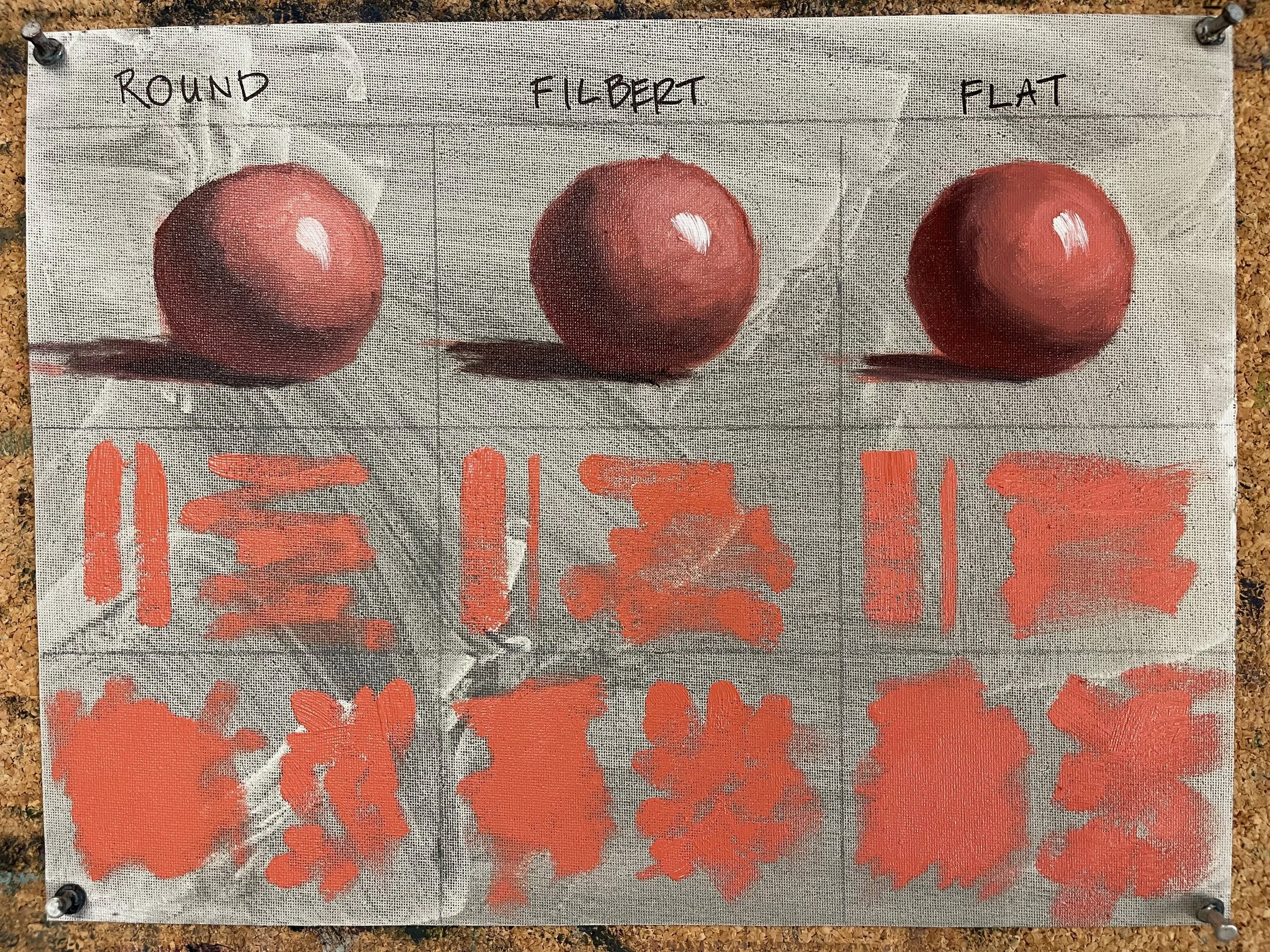One of the most fun parts of the lesson was exploring how different shapes create unique marks on the canvas. The three essentials? Round, filbert, and flat.